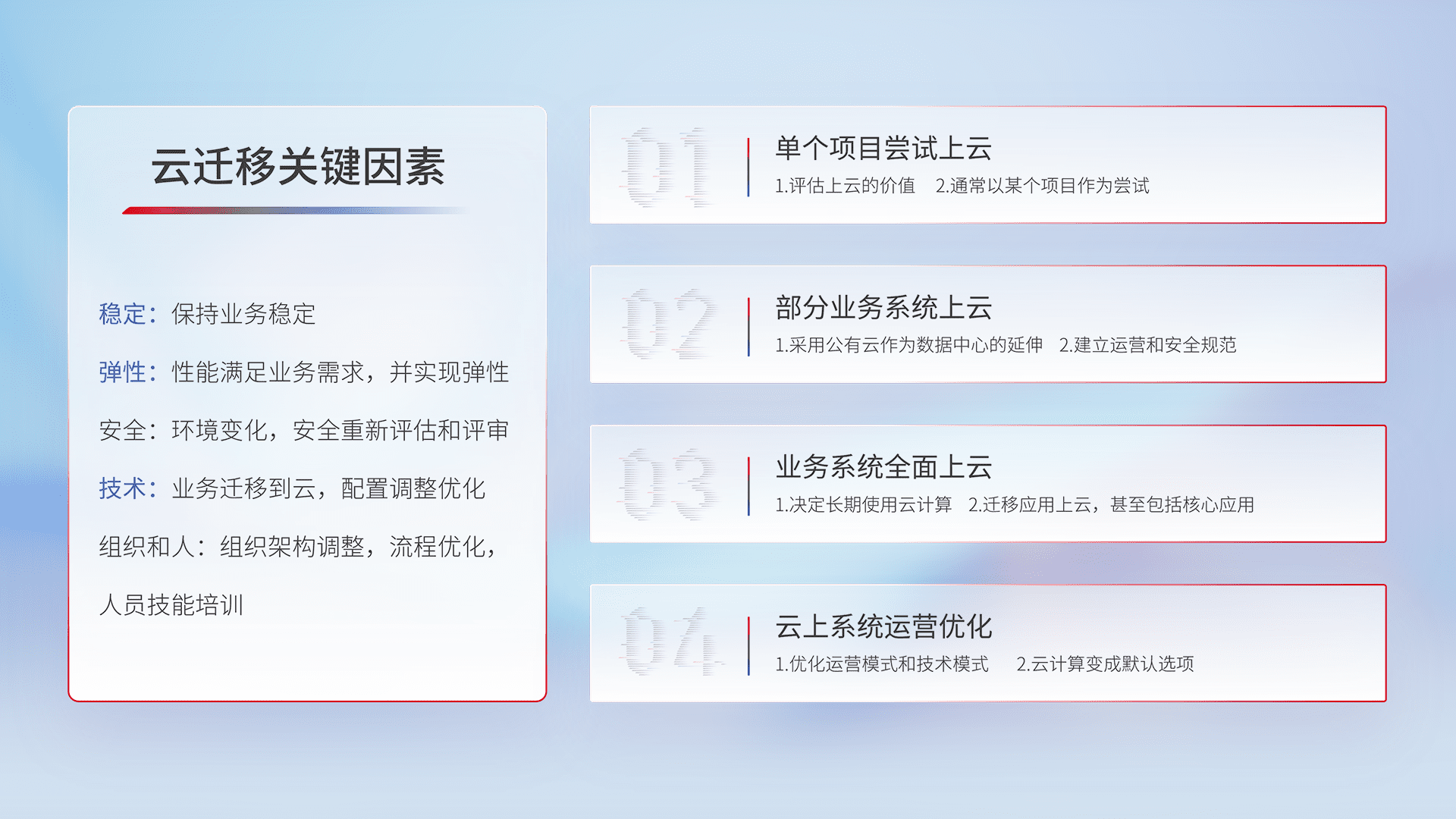 结合实际业务,,从规划设计、、云平台选型、、、、云原生改造、、、、数据迁移、、集成交付,,,迁移全过程为客户识别最佳上云路径,,,做好风险识别管理,,,设计网络架构、、、、身份权限、、、、安全审计合规、、、、操作审计、、、日志审计、、、监控告警策略、、多站点容灾设计等,,对云上基础设施进行整体规划,,,提升IT治理水平,,,,以满足弹性、、、、高可用、、高性能的需求。。。