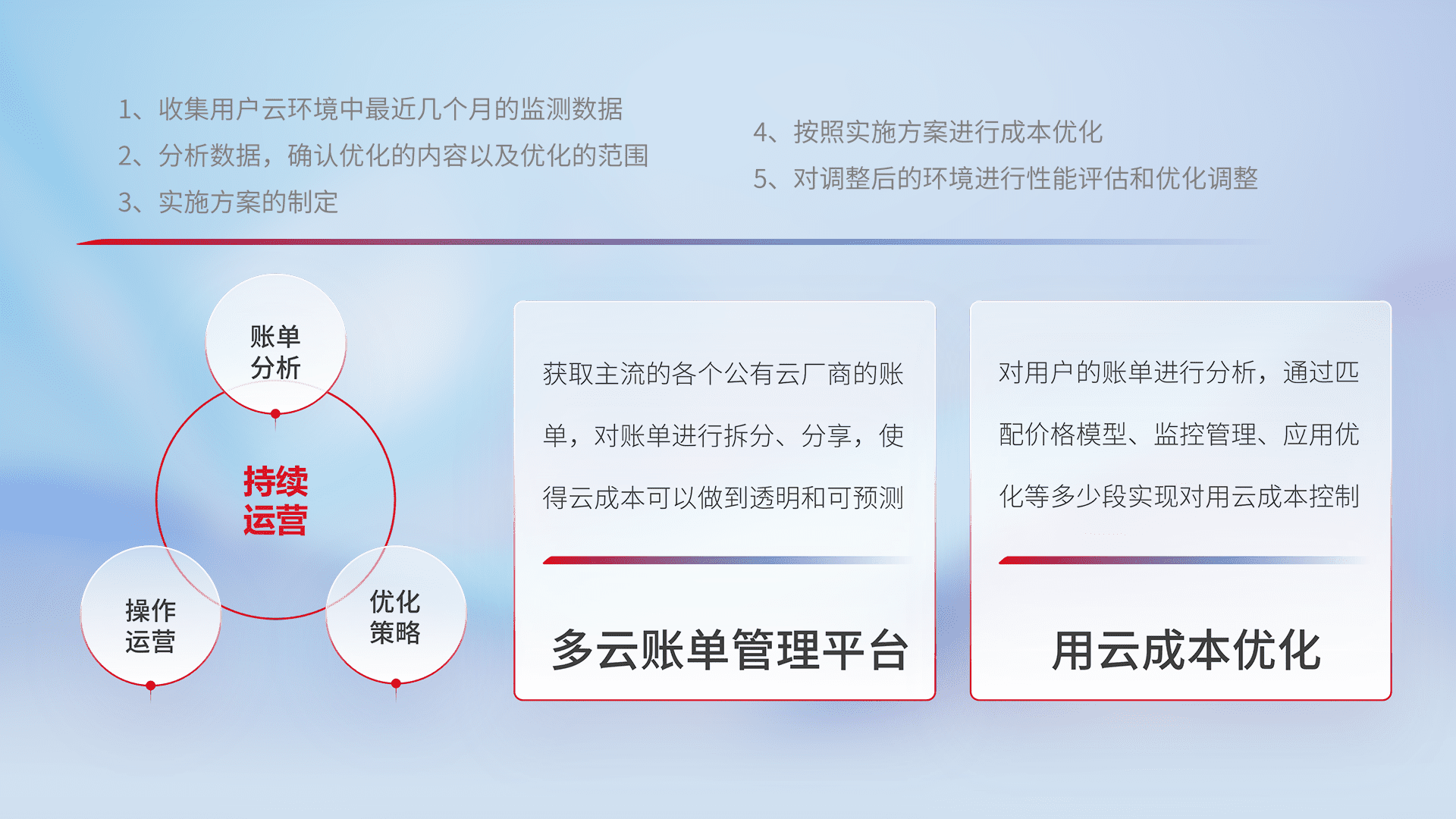 通过多云纳管,,以统一的资源数据模型把客户的云资源进行抽象和封装,,,,进而实现对多云资源的统一操作,,,,保障云资源管理的可靠性、、、稳定性与可用性。。。量身定制化运维内容,,,,配置、、、开发运维、、补丁管理、、、、备份、、、、监控、、、认证和访问管理、、、、审计和日常巡检等,,,,保障在用云过程中的可靠度,,,,稳定度以及高可用率。。
